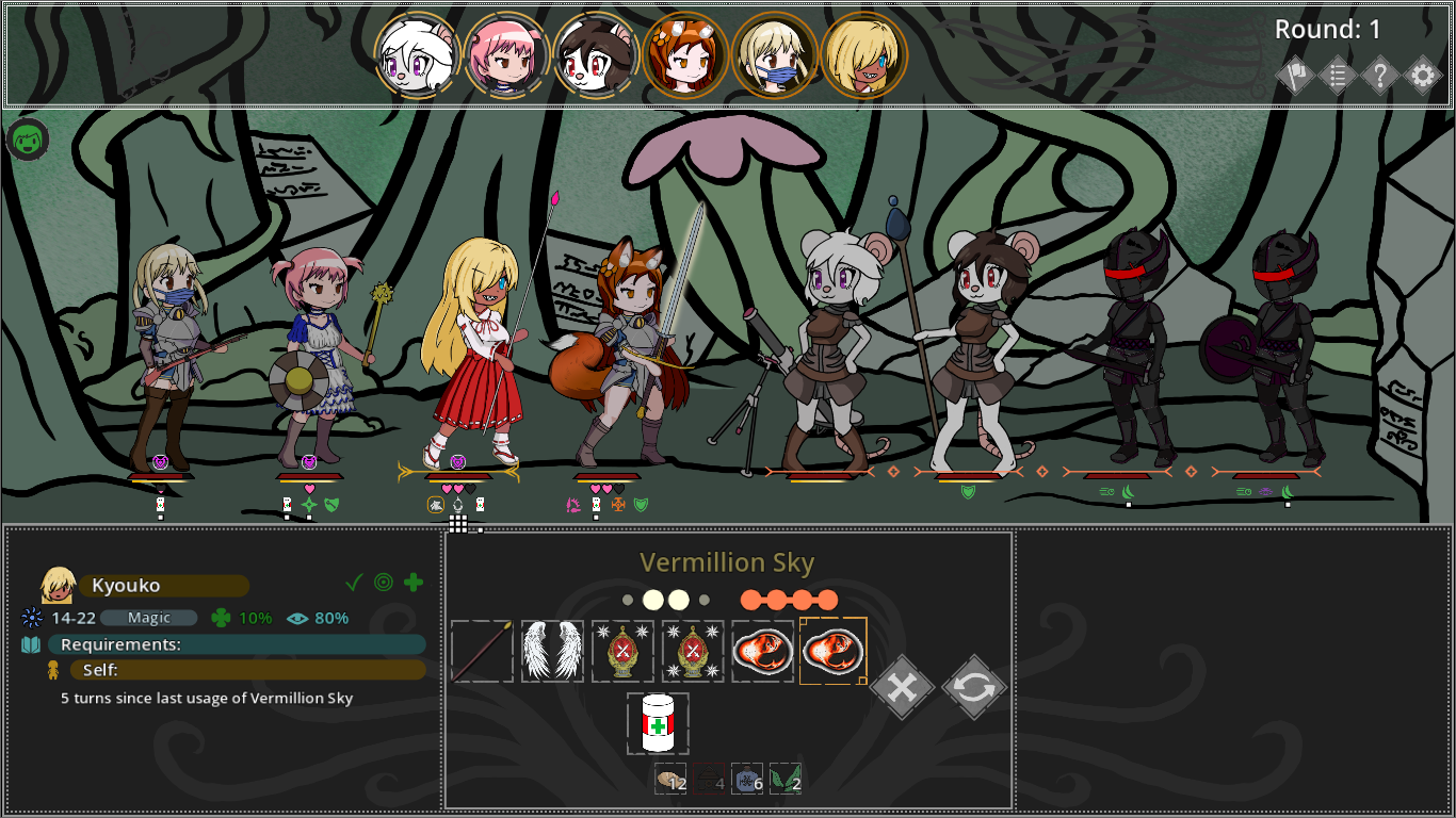 Overall there's not a huge amount of stuff here and it could use some tweaking, but it's neat in concept. Have you thought about looking at how slime merging works and changing the shades to fuse or upgrade mid-combat, since enemy fusions seem to be a key part of the theme here? It'd probably be a ton of work to do more than a few combinations that way, and I don't know what it'd do to the balance, but it seems like an idea worth at least toying around with?